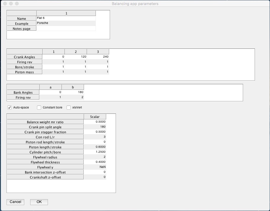 All the calculations assume a crank radius (stroke/2) = 1 and a rotational speed of omega = 1 radian/second. This cannot be set (no point!). You can however set a piston mass, for instance to investigate a triple expansion steam engine where some pistons are heavier than others.