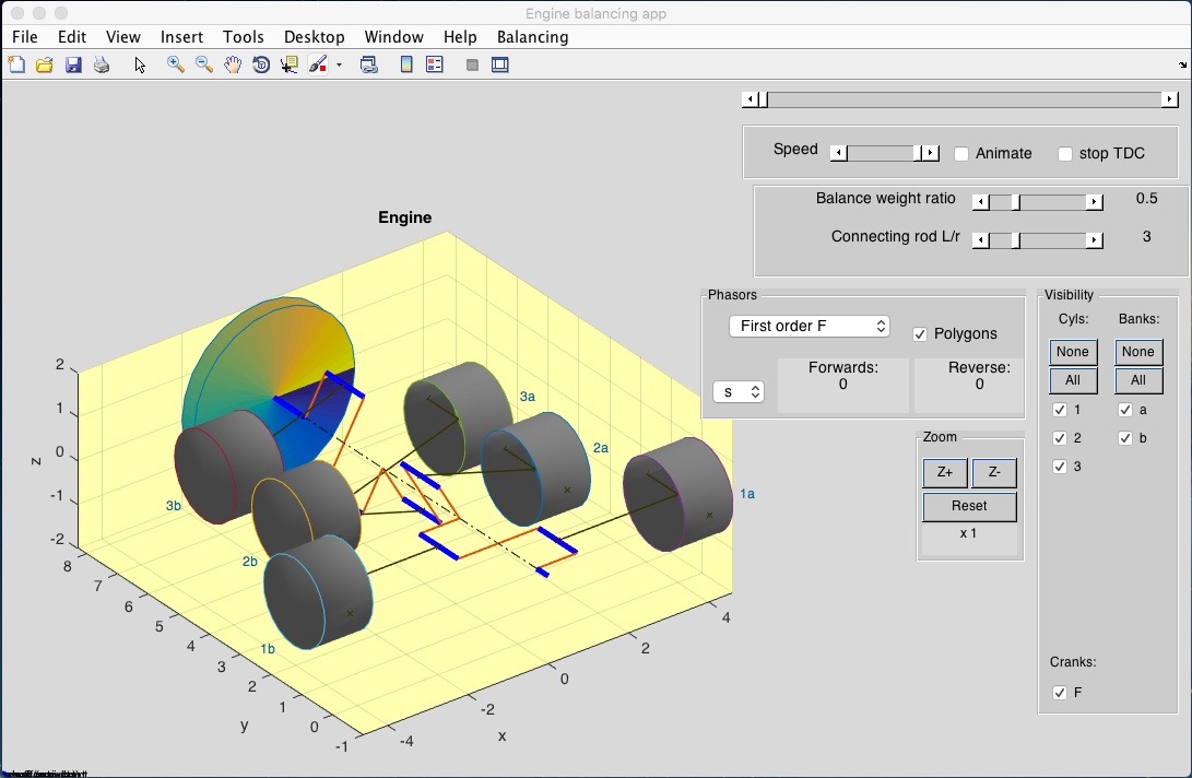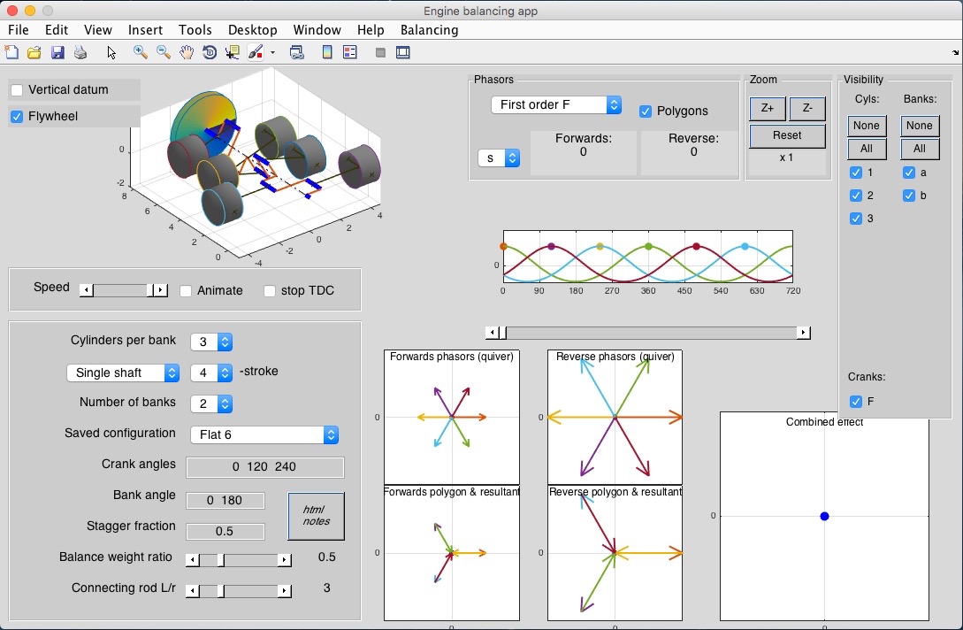 The rest should be self-explanatory. If you cannot see a resultant phasor, it is probably because the components sum to zero. It may help to zoom in and out and/or turn off phasor visibility, stop at each Top Dead Centre and turn on the phasor for that piston so you can see the diagram "building up” as it would on paper.