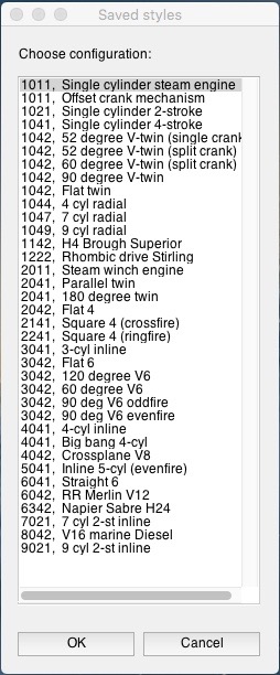 - If you set up an engine using the controls on the window (instead of using the “Browse database” menu) the program will search the database for all engines having the required CHSB combination and display the first of these. All the relevant styles will be listed in the “Saved configuration” popup (so with 3,0,4,2 you would get the five configurations shown in the style database window above). If no configuration is found, the program will generate a default one, “Auto”. This tries to be sensible but may not be the best possible.
